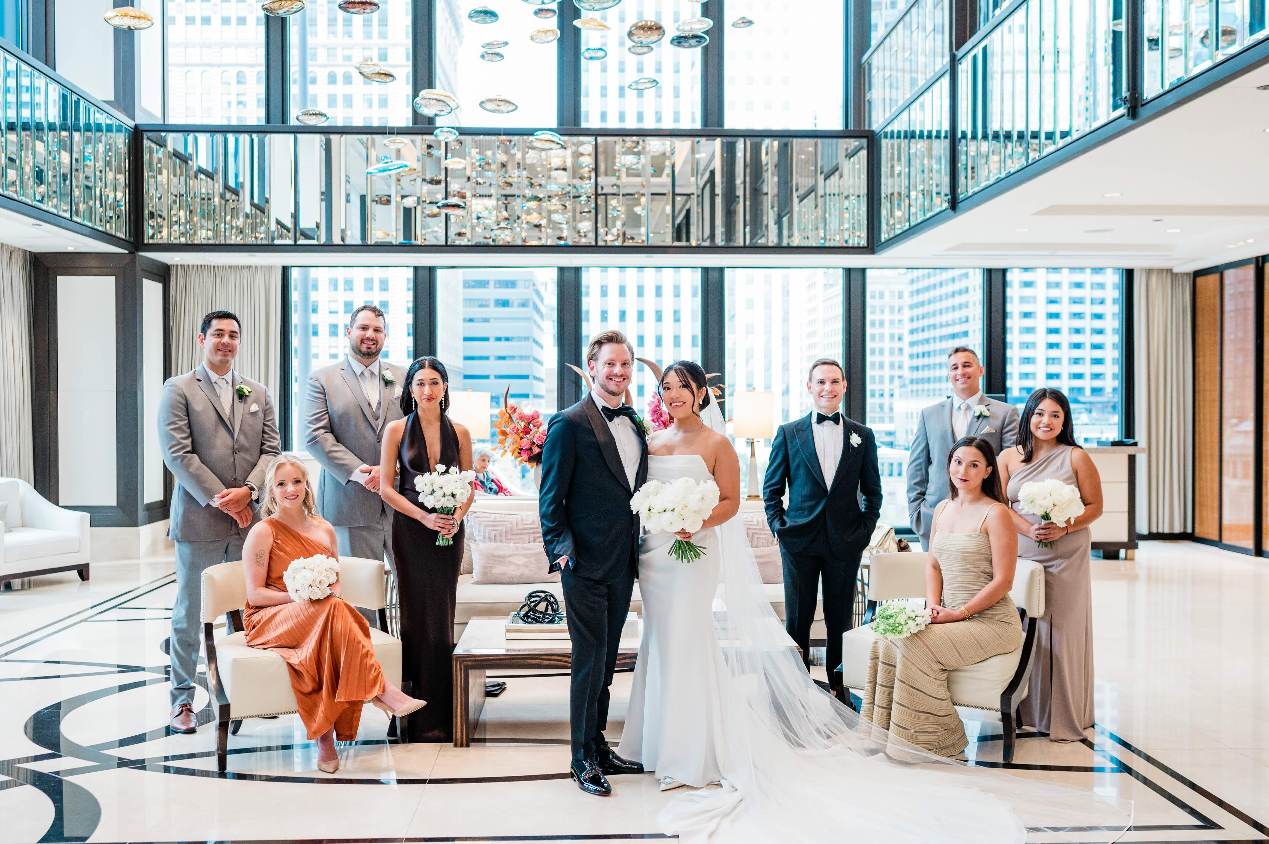 Charley and Peter’s wedding day at The Langham was equal parts elegant and beautifully unpredictable. They got ready and celebrated all in one place, surrounded by the timeless luxury of the hotel. The Chicago wind made a bold appearance that day, but we pivoted seamlessly to portraits inside the stunning Langham lobby. And honestly, the grand interiors made for some of the most beautiful, classic images of the day.